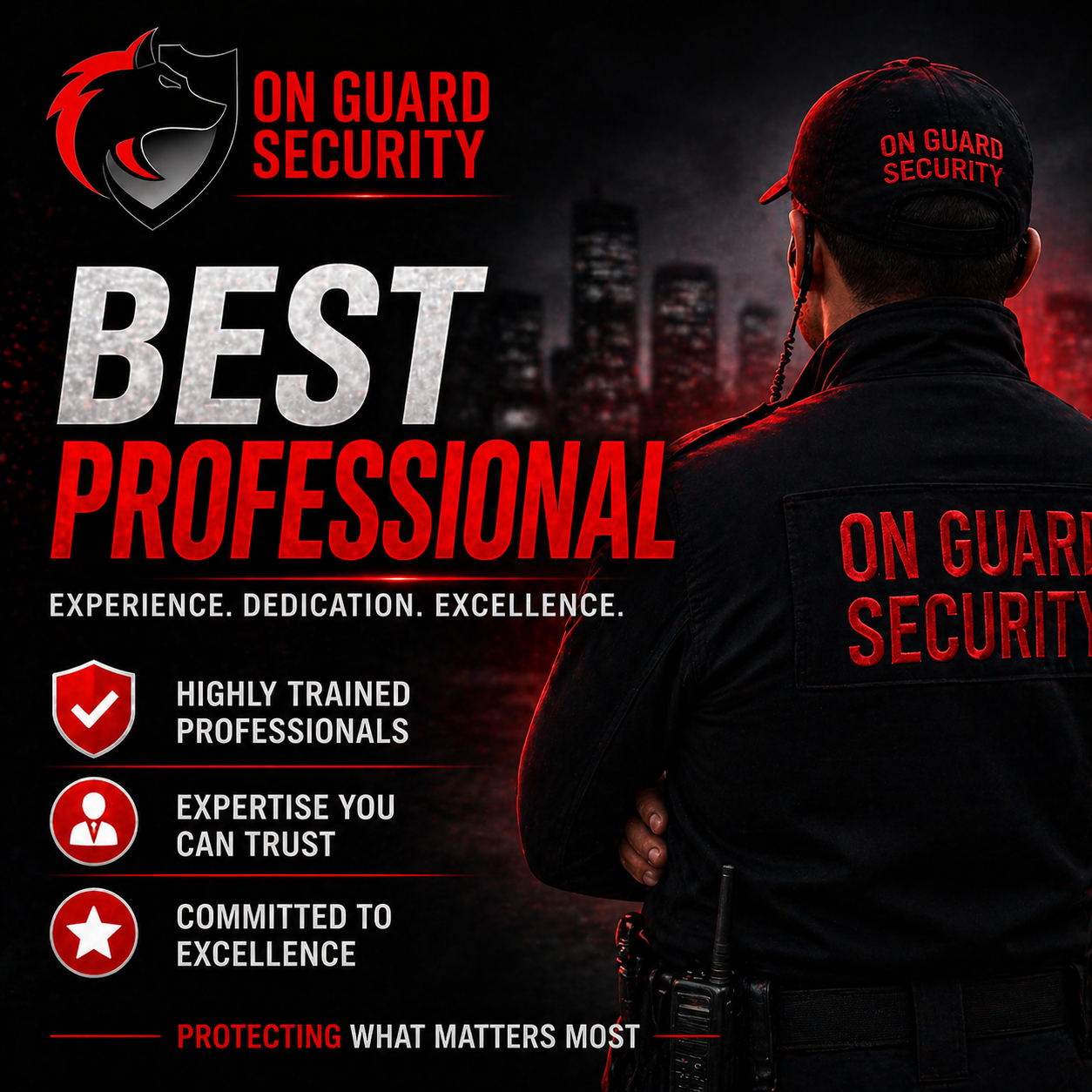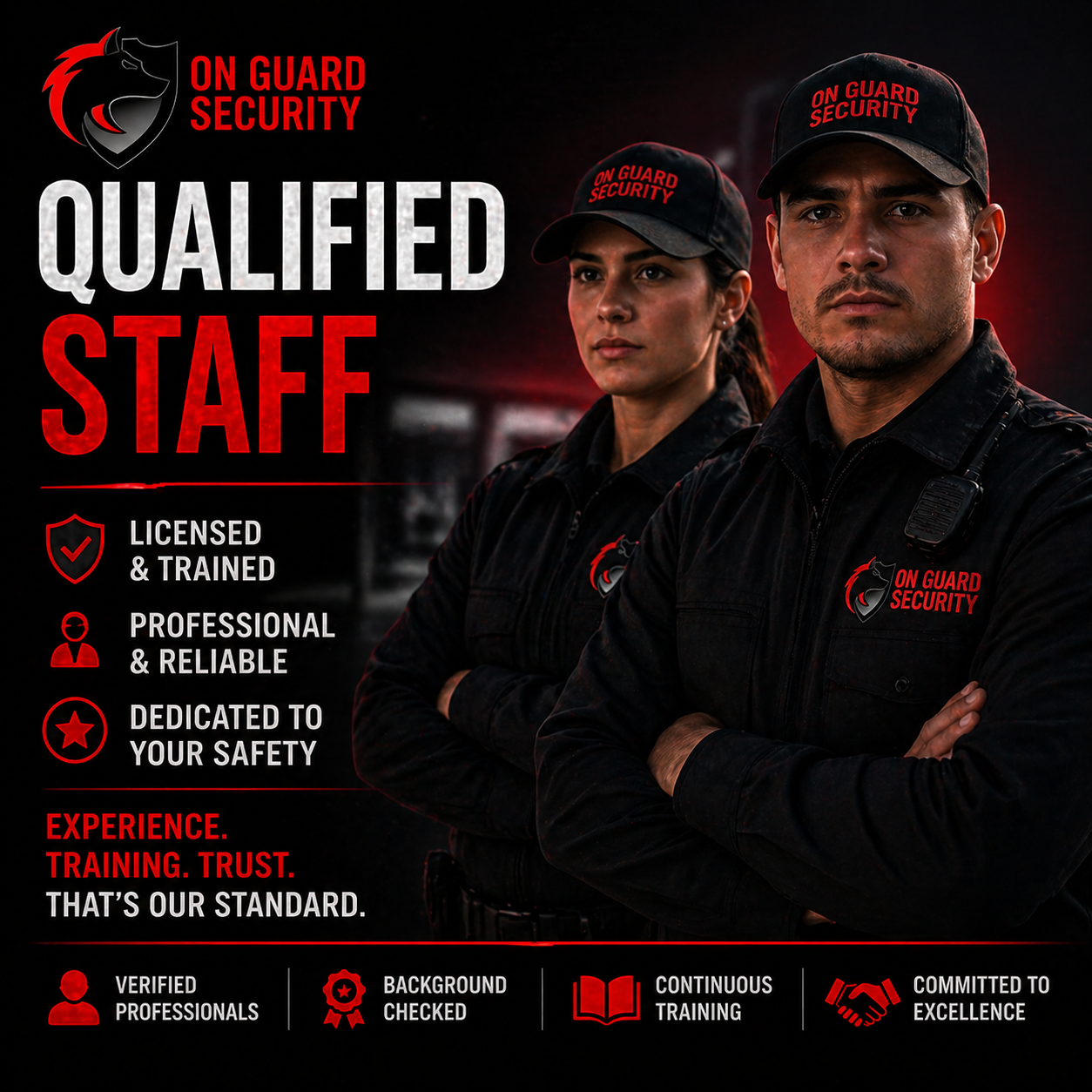 Here at On Guard Security, we believe providing professional security services to all our clients is about much more than just the uniform. The business of security begins with trust and end with prevention and protection. On Guard Security has been in the security service business for over 10 years. With an extensive background in protection services, our team is highly dedicated and trained to ensure our clients are provided with the utmost protection available. Upon hiring, all our considered guards are put through a week of one on one training with senior Security officers, this insures us, all our employees are trained up to On Guard Security satisfaction. As new laws tend to come and go, we here at On Guard ensure our guards are trained to each requirement.